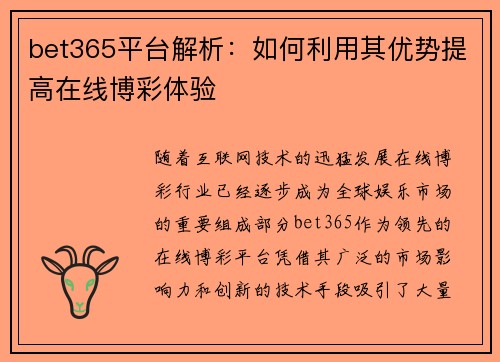 随着互联网技术的迅猛发展,在线博彩行业已经逐步成为全球娱乐市场的重要组成部分。bet365作为领先的在线博彩平台,凭借其广泛的市场影响力和创新的技术手段,吸引了大量玩家。如何利用bet365平台的优势提高在线博彩体验,已成为许多玩家关注的焦点。本文将从四个方面对bet365平台进行深入解析,并探讨如何通过这些优势提升博彩体验。首先,本文将讨论bet365平台的多样化博彩产品和市场覆盖,其次,我们将分析平台的用户体验和界面设计。然后,聚焦于bet365在支付方式和资金安全方面的优势,最后,我们将探讨其客户服务系统如何为玩家提供优质支持。通过这些方面的分析,读者将能够更全面地理解如何最大化地利用bet365平台提升博彩体验。